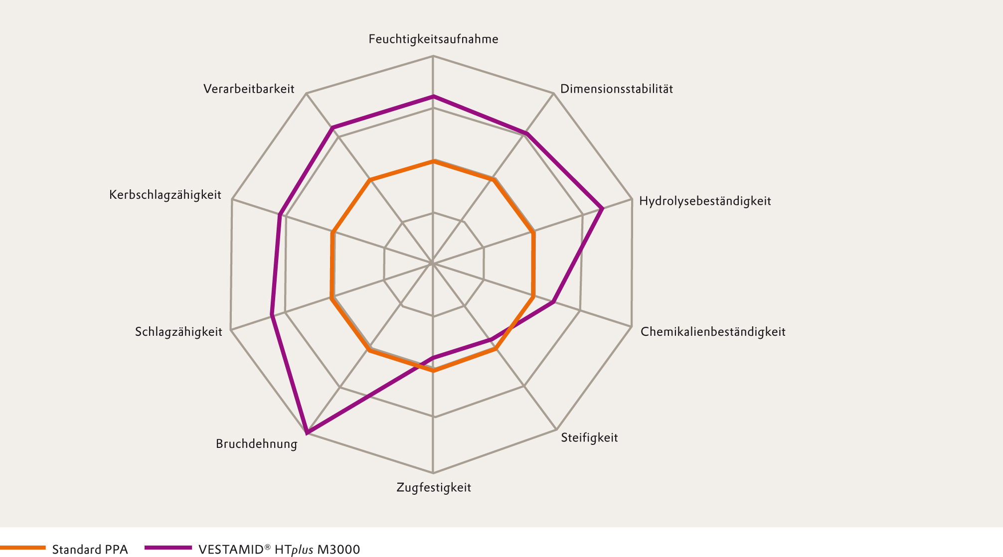 Die hinlänglich bekannten und kommerziell erhältlichen Polyphthal¬amide basieren dagegen auf der erdölbasierten PA6T Chemie. Gegen¬über diesen Produkten hebt sich die neue Generation der PA10T-Polymere durch ein breiteres Verarbeitungsfenster hervor, so dass die Handhabung vereinfacht wird. Darüber hinaus nehmen Materialien der VESTAMID® HTplus M3000-Serie wesentlich weniger Wasser auf, woraus eine bessere Dimensionsstabilität und verbesserte Hydrolysestabilität resultiert.