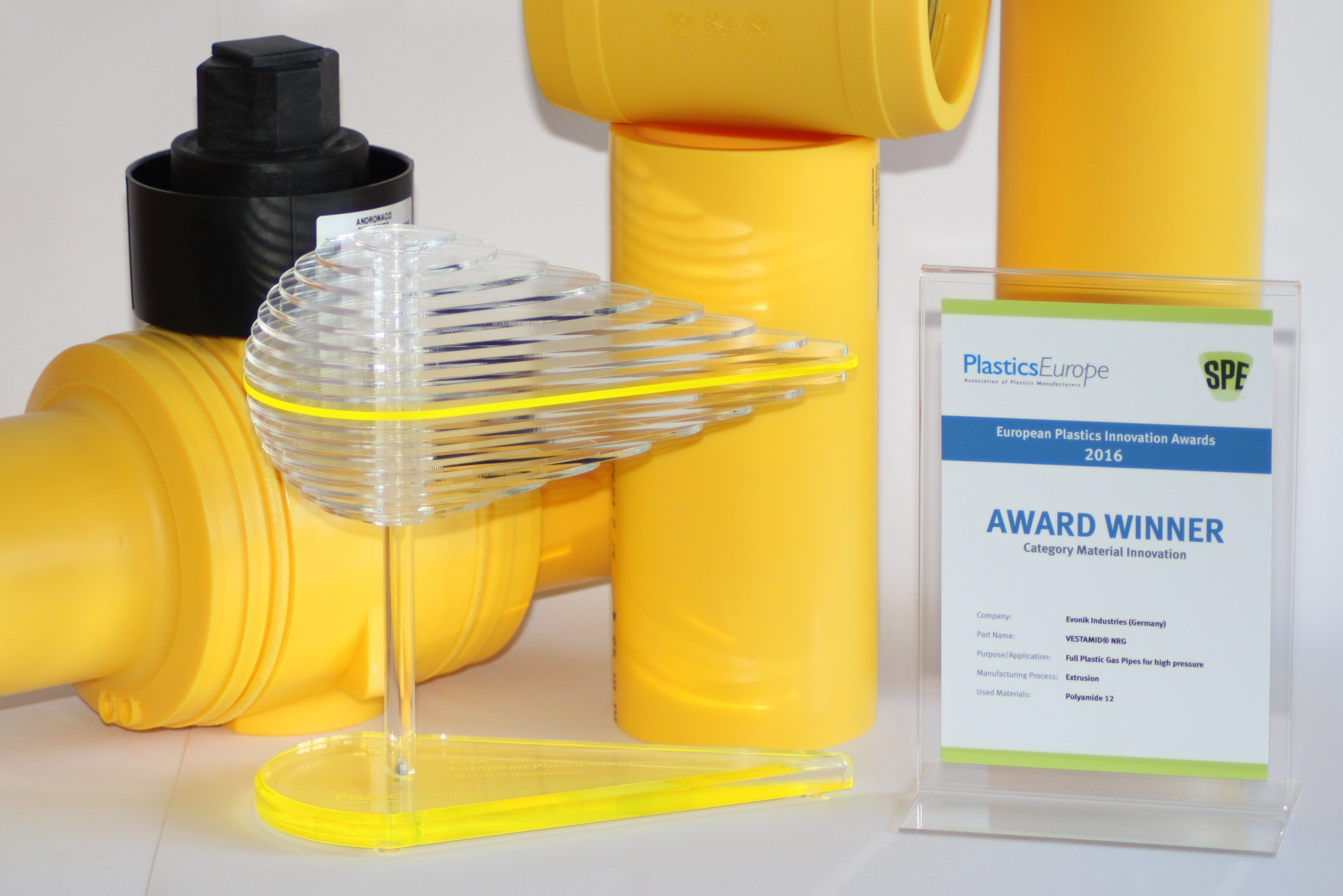 Für den Einsatz des Polyamid 12 (PA 12) VESTAMID® NRG in Gashochdruckleitungen erhielt das Segment Resource Efficiency von Evonik, Essen, Ende Januar den European Plastics Innovation Award in der Kategorie „Material Innovation“. Der Kunststofferzeugerverband PlasticsEurope und die Society of Plastics Engineers (SPE) hatten jenen erstmals in acht Kategorien gemeinsam ausgelobt. Er zeichnet Unternehmen aus, die mit besonders herausragenden innovativen Entwicklungen im Bereich der Kunststofftechnologie auf sich aufmerksam machen.