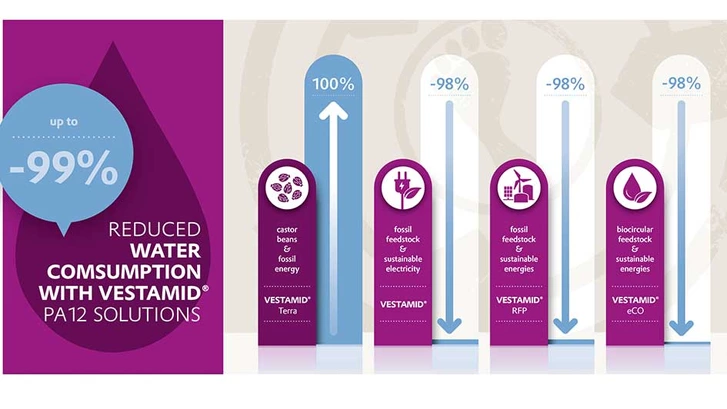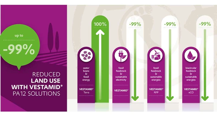 While we work towards more resource-efficient production and sustainable products, we also want to be as transparent as possible with our customers. As such, we have prepared comprehensive life cycle assessments (LCAs) for the majority of our VESTAMID® compounds and had these assessments externally certified by TUV Rheinland. These LCA certificates are now available on request. Besides information on the carbon footprint, these assessments also cover relevant impact categories, such as water and land use.