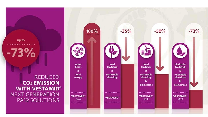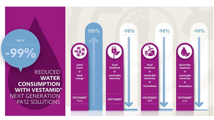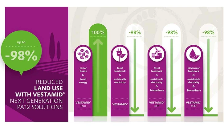 Since 2009, Evonik has also marketed VESTAMID® Terra molding compounds, which are based on monomers obtained from castor oil. In comparison, VESTAMID® RFP shows a significantly improved eco-balance: the carbon footprint is reduced by 40 percent, while water consumption and land use are more than 99 percent lower.