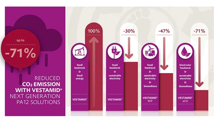 Evonik has been producing polyamide 12 at the Marl Chemical Park in North Rhine-Westphalia for more than 50 years and uses the electricity and steam produced there by its own state-of-the-art and efficient combined heat and power plants. By using biomethane generated from waste in these plants, emissions of the climate gas carbon dioxide for VESTAMID® RFP are reduced by an average of 40 percent, while water consumption and land use remain almost the same.
